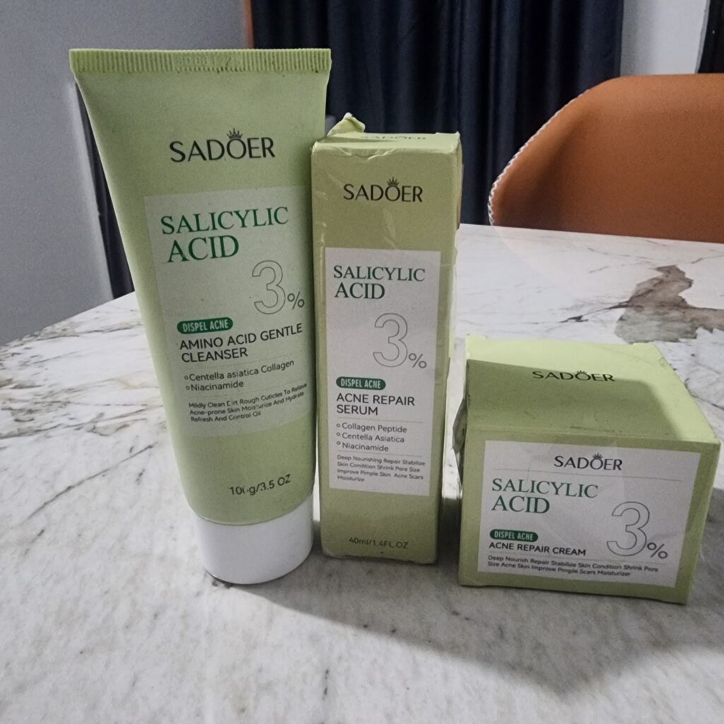 A friend recommended I try the sadoer acne repair set and honestly, I didn’t expect much but to my surprise i started noticing changes even from the first time i used it and within 2 weeks my face was looking almost 100% clean and fresh. Everything happened so fast, and a lot of people have been asking me for the product I used